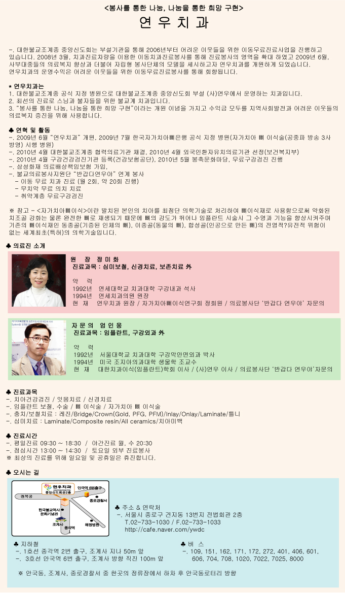 -. ´ëÇѺұ³Á¶°èÁ¾ Á߾ӽŵµÈ¸´Â ºÎ¼³±â°üÀ» ÅëÇØ 2006³âºÎÅÍ ¾î·Á¿î ÀÌ¿ôµéÀ» À§ÇÑ À̵¿¹«·áÁø·á»ç¾÷À» ÁøÇàÇϰí ÀÖ½À´Ï´Ù. 2008³â 3¿ù, Ä¡°úÁø·áÂ÷·®À» ÀÌ¿ëÇÑ À̵¿Ä¡°úÁø·áºÀ»ç¸¦ ÅëÇØ Áø·áºÀ»çÀÇ ¿µ¿ªÀ» È®´ë ÇÏ¿´°í 2009³â 6¿ù, »çºÎ´ëÁßµéÀÇ ÀǷẹÁö Çâ»ó°ú ´õºÒ¾î ÀÚ¸³Çü ºÀ»ç´ÜüÀÇ ¸ðµ¨À» ¼¼½ÃÇϰíÀÚ ¿¬¿ìÄ¡°ú¸¦ °³¿øÇÏ°Ô µÇ¾ú½À´Ï´Ù. ¿¬¿ìÄ¡°úÀÇ ¿î¿µ¼öÀÍÀº ¾î·Á¿î ÀÌ¿ôµéÀ» À§ÇÑ À̵¿¹«·áÁø·áºÀ»ç¸¦ ÅëÇØ ȸÇâµË´Ï´Ù.